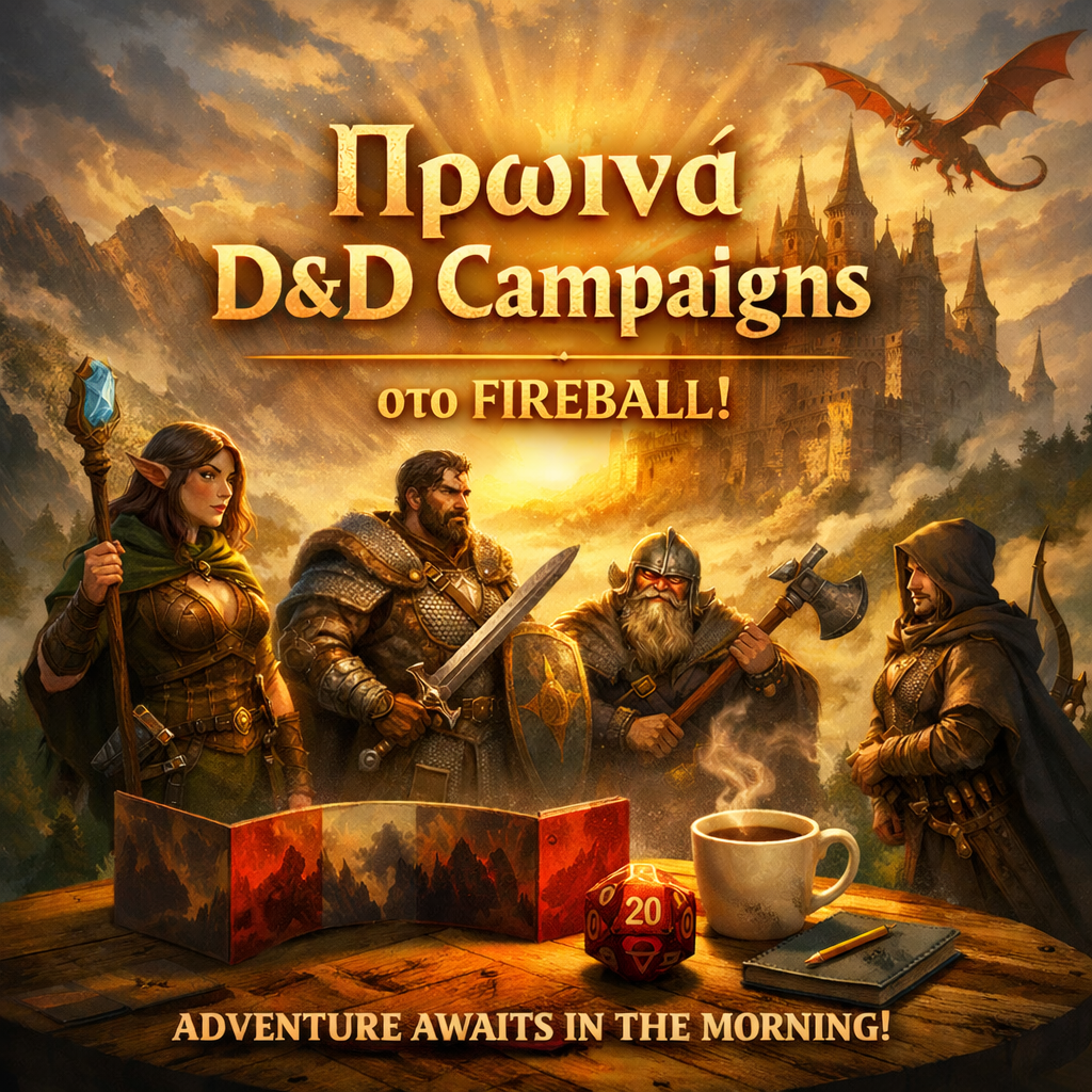 Νέα Dungeons & Dragons Campaigns στο Fireball Game Rooms, ιδανικά για όσους/όσες θέλουν να ζήσουν επικές ιστορίες σε χαλαρό, πρωινό ωράριο. Με καφεδάκι στο χέρι, ζάρια στο τραπέζι και φαντασία στο κόκκινο, ξεκινάμε ταξίδια γεμάτα δράση, μυστήριο και ηρωικές αποφάσεις, έτσι, για να πάει καλά η μέρα!